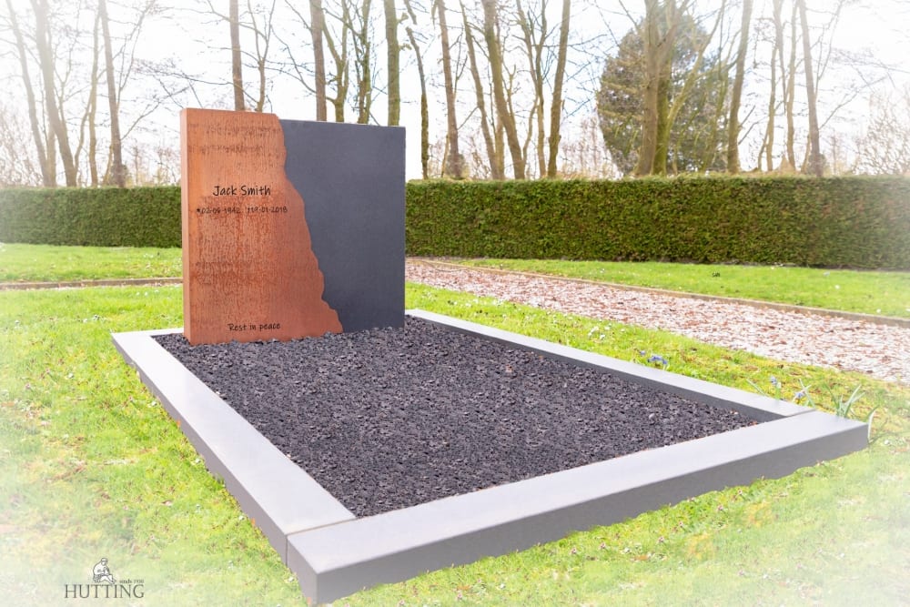 Een modern monument met een ingetogen en natuurlijke uitstraling. Het gezoete Zwart Graniet met het stoere cortènstaal is een stijlvolle en stoere combinatie. De tekst is in het cortènstaal uitgesneden en is daarmee volledig onderhoudsvrij. Ook het graniet heeft erg weinig onderhoud nodig. 1 tot 2 keer per jaar het monument met een nat doekje afnemen is al voldoende.
