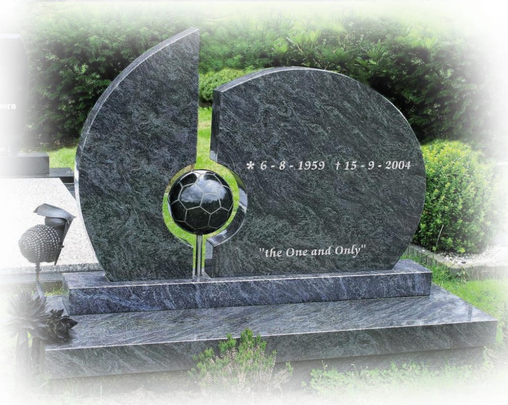 Fraai gestyleerd monument, in Orion Blue Graniet. Royaal uitgevoerd, voetplaat op verhoogde plinten, tussen de beide helften van de letterplaat is een ronde sparing uitgeslepen waarin een Zwart Granieten voetbal op een RVS stang is verwerkt. (O.V.)