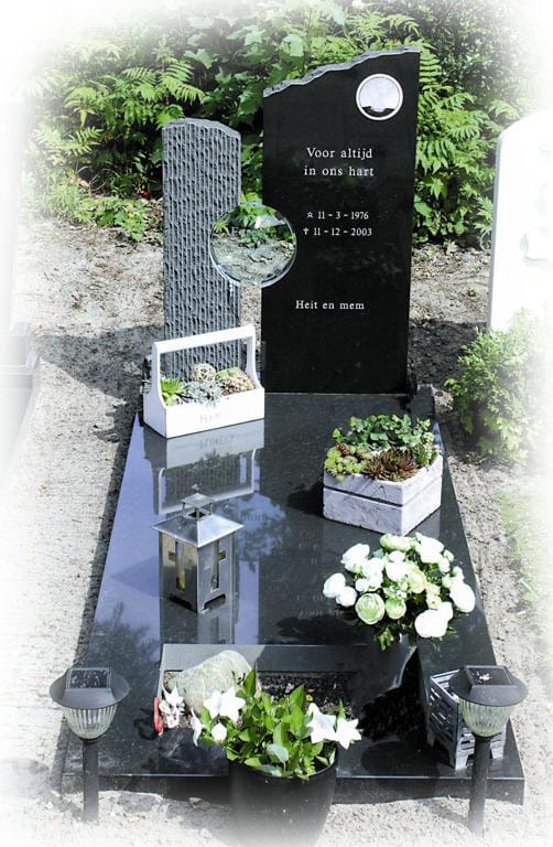 Stijlvol monument in gepolijst Zwart Graniet. Letterplaat in twee delen. De linker zuil is ruw bekapt, hiertussen is een 19 mm dikke glazen cirkel verwerkt waarin eventueel een versiering of portret geëtst kan worden. (O.V.) 8 cm.