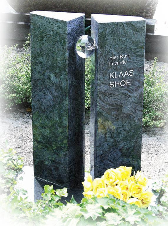 Monument op sokkel, Orion Blue Graniet, 2 taps geslepen zuilen verbonden met eventueel een glazen bol. (prijs per glazen bol, incl. bevestigen is €145,-). (O.V.) 15 cm.