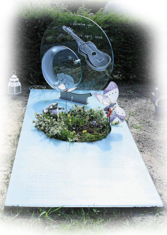 Bijzonder monument geheel in glas uitgevoerd. Liggende plaat in 19 mm dik melkglas met uitgewerkte cirkel voor beplanting. Twee staande cirkels van glas verbonden, waarin fraai etswerk op aangebracht kan worden. (O.V.).