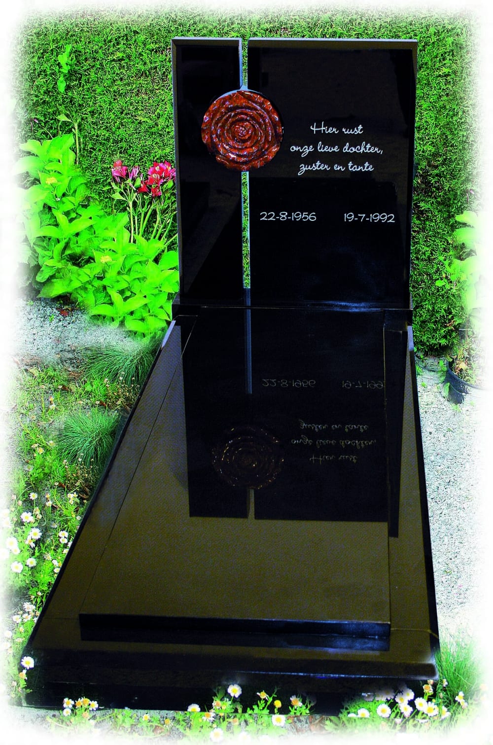 Stijlvol, strak gepolijst Zwart Granieten monument met als contrast een donkerrode in reliëf uitgewerkte Granieten roos, heel bijzonder. (O.V.) 10 cm.
