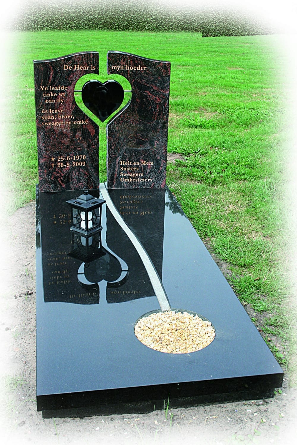 Fraai monument. Zwart Granieten zerk van 6 cm op plinten met een uitgefreesde gleuf en een klein rond tuintje. Beide letterplaten staan iets naar elkaar toe, zijn uitgevoerd in Aurora Red Graniet en zijn verbonden met een Zwart Granieten hart. (O.V.) 8 cm € 3.820,- Eventueel zonder plint. (O.V.) 8 cm € 3.360,-