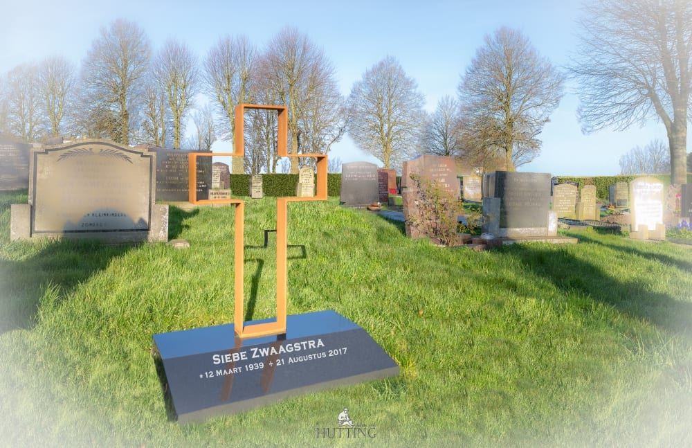 Een modern, ingetogen monument. Het cortenstalen kruis is geplaatst op een gepolijste Zwart Granieten voetplaat. De voetplaat is van een schuin vlak voorzien waar de tekst op aangebracht kan worden.