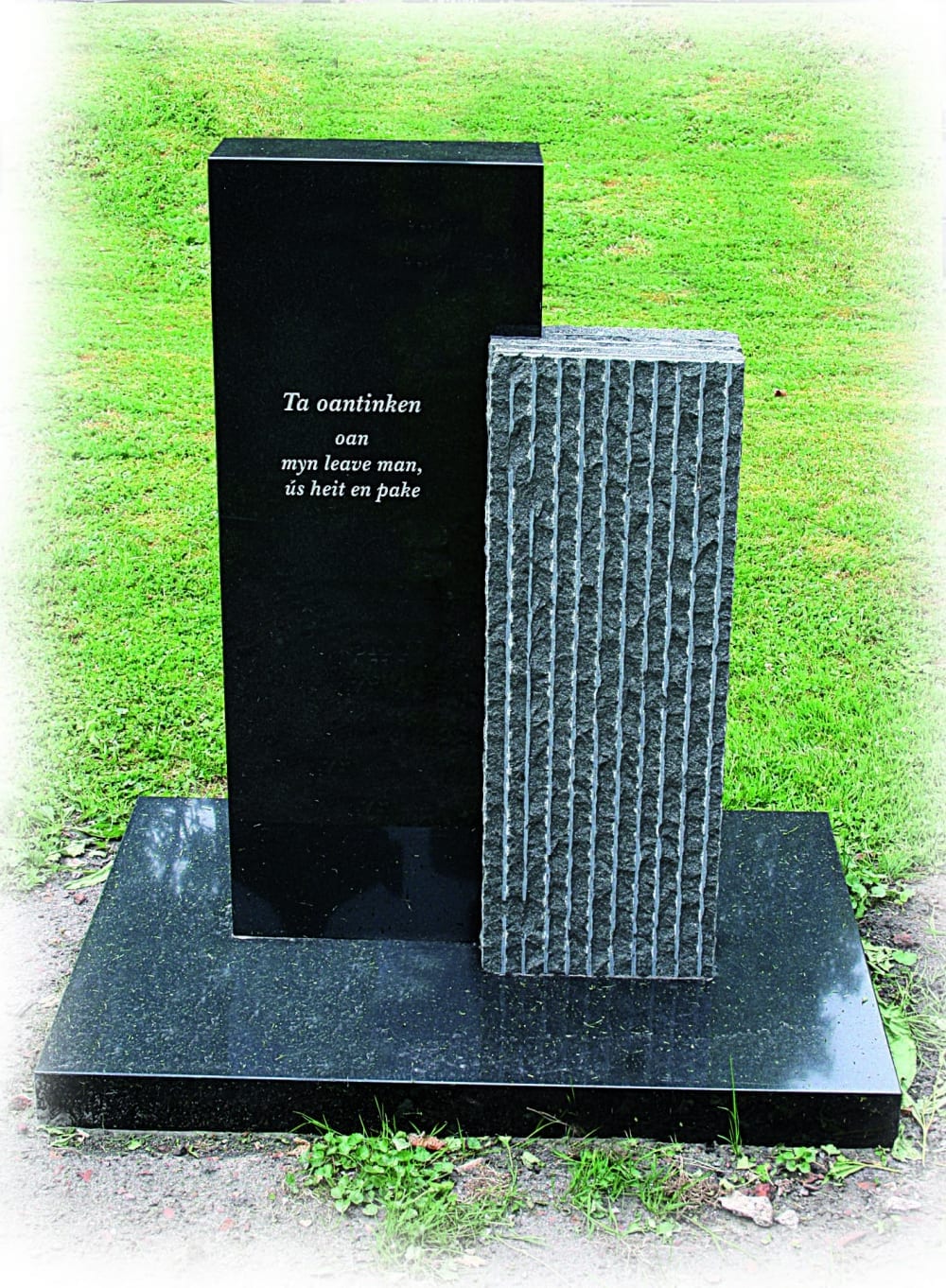 Strak, eenvoudig monument geheel uitgevoerd in Zwart Graniet. Linker zuil is gepolijst, de rechter gezaagd en ruw afgeslagen.(O.V.) 10 cm.