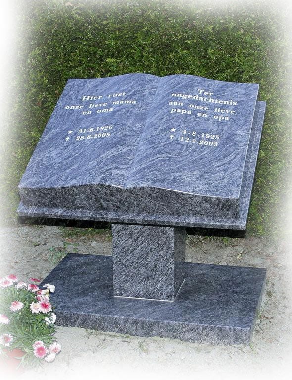 Open boek op zuil en voetplaat. Uitgevoerd in Orion Blue Graniet. (O.V.).