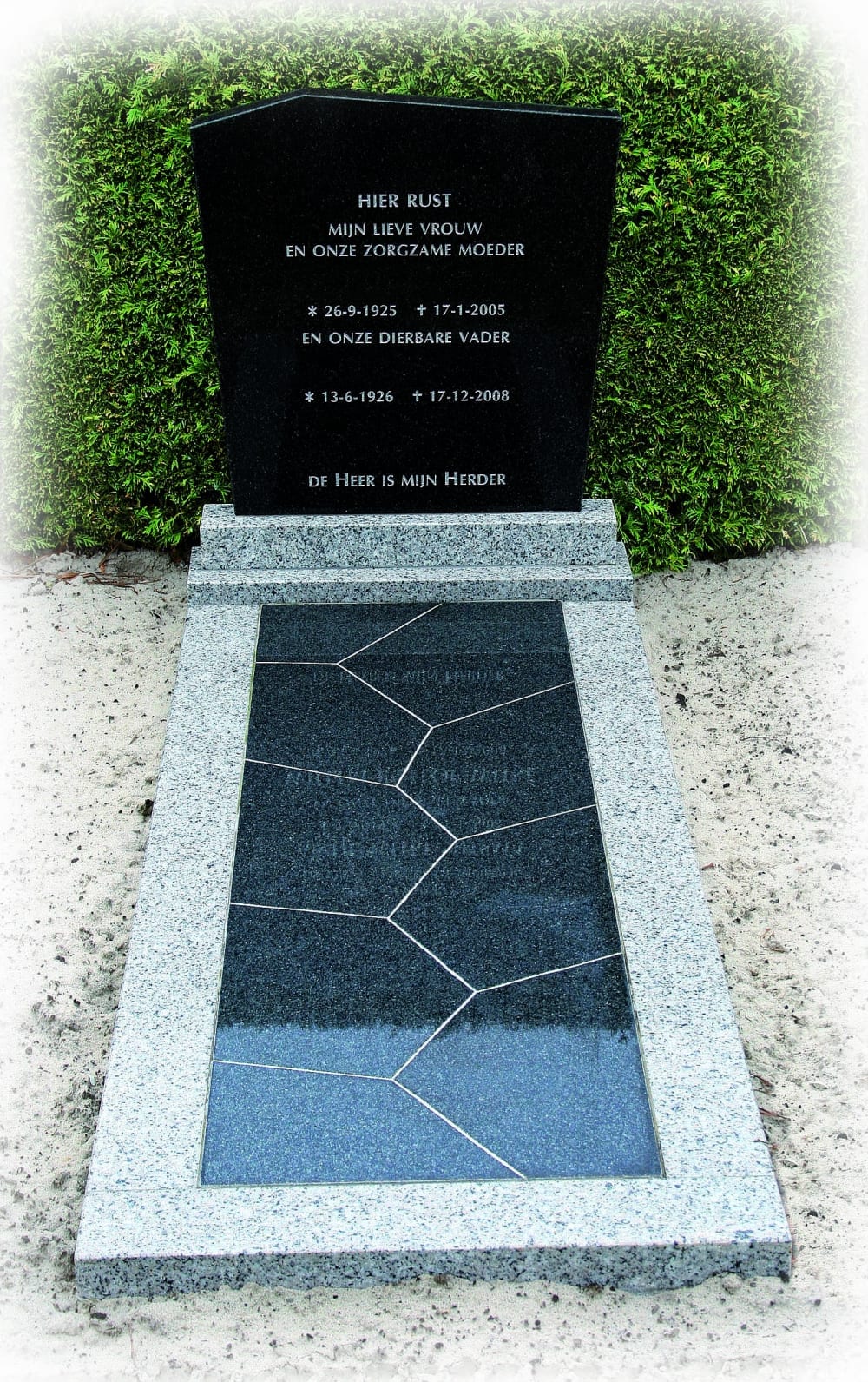 Eenvoudig monument in Busgowetz en Frans Tarn Graniet. In de inlegplaat zijn schijnvoegen geslepen om een mozaiëkvloer te creëren.(O.V.) 8 cm.