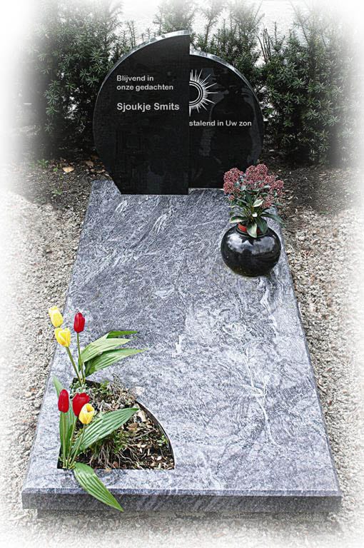 Twee verspringende halve cirkels in Zwart Graniet op een liggende grafzerk van Orion Graniet. Op een verhoogde plint rondom uitgevoerd. (O.V.) 8 cm € 2.990,- Eventueel zonder plint. (O.V.) 8 cm € 2.496,-