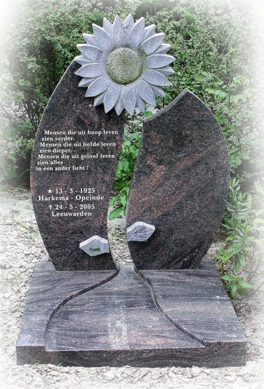 Monument in Himalaya Blue Graniet met fraai uitgewerkte zonnebloem. (O.V.).