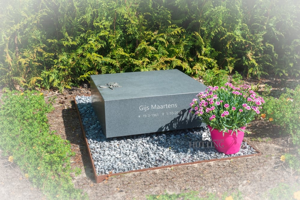 Een bijzonder eenvoudig en strak uitgevoerd monument gemaakt van gezoete Zwarte Graniet. Het granieten blok is 60 x 60 x 20 cm. groot en is op een kleinere basis geplaatst zodat het enkele centimeters boven de grond ‘zweeft’. Afgebeeld monument is geplaatst in een cortènstalen omranding maar kan eventueel ook van RVS of natuursteen worden geleverd.