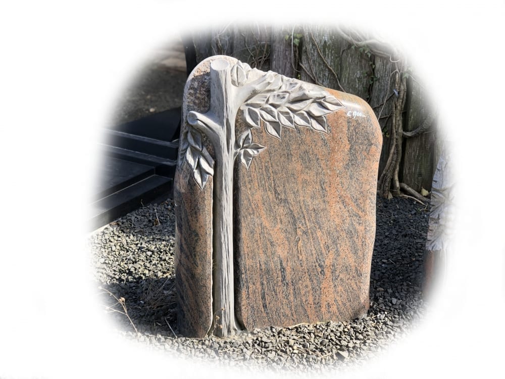 Een enkel staand monument van Halmstad graniet met een gebeeldhouwde boom.