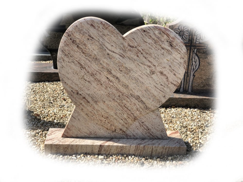 Een dubbel staand monument met een hartvorm in de letterplaat, geheel van Shivakashy Yellow graniet.